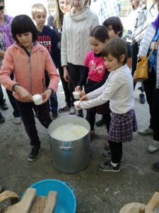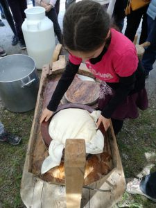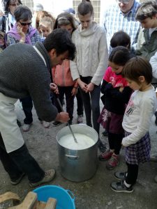 Sabato 27 e Domenica 28 Aprile, si è svolta a Macra, in Valle Maira, la consueta “Fiera di San Marcelin”. Quest’anno abbiamo partecipato anche noi: in collaborazione con l’Ecomuseo dell’alta Valle Maira, Sergio ha dato una dimostrazione pratica dell’arte della caseificazione. Hanno partecipato all’attività anche numerosi bambini, i quali, non solo hanno assistito alla trasformazione del latte in formaggio, ma hanno anche potuto provare con le loro mani cosa vuol dire essere un casaro. Prima hanno rotto la cagliata innescando, poi hanno mescolato lentamente per favorire la separazione del siero dalla cagliata. Successivamente hanno aiutato Sergio a raccogliere la cagliata nella “rirolo”, il tipico telo da formaggio. A questo punto, il formaggio è stato pigiato a mano sul banco da lavoro fino a fare uscire quasi tutto il siero. Infine, il formaggio è stato adagiato nella “fiselo”, la forma di legno, ed è stato messo sotto dei pesi per favorire ulteriormente la fuoriuscita del siero. Dopo aver girato il formaggio alcune volte, Sergio ha porto ai bambini la matita alimentare con cui cui ognuno ha potuto firmare il prodotto, rendendolo un capolavoro. Tra circa due mesi, sarà possibile gustare il Nostrale di San Marcelin.