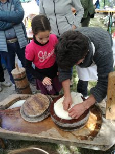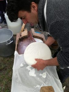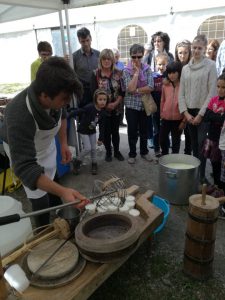 Sabato 27 e Domenica 28 Aprile, si è svolta a Macra, in Valle Maira, la consueta “Fiera di San Marcelin”. Quest’anno abbiamo partecipato anche noi: in collaborazione con l’Ecomuseo dell’alta Valle Maira, Sergio ha dato una dimostrazione pratica dell’arte della caseificazione. Hanno partecipato all’attività anche numerosi bambini, i quali, non solo hanno assistito alla trasformazione del latte in formaggio, ma hanno anche potuto provare con le loro mani cosa vuol dire essere un casaro. Prima hanno rotto la cagliata innescando, poi hanno mescolato lentamente per favorire la separazione del siero dalla cagliata. Successivamente hanno aiutato Sergio a raccogliere la cagliata nella “rirolo”, il tipico telo da formaggio. A questo punto, il formaggio è stato pigiato a mano sul banco da lavoro fino a fare uscire quasi tutto il siero. Infine, il formaggio è stato adagiato nella “fiselo”, la forma di legno, ed è stato messo sotto dei pesi per favorire ulteriormente la fuoriuscita del siero. Dopo aver girato il formaggio alcune volte, Sergio ha porto ai bambini la matita alimentare con cui cui ognuno ha potuto firmare il prodotto, rendendolo un capolavoro. Tra circa due mesi, sarà possibile gustare il Nostrale di San Marcelin.
